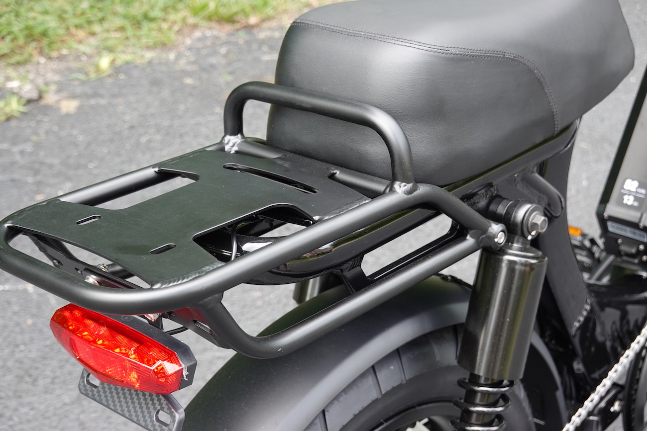 Den har både for- og baghjulsophæng samt et ret anstændigt sæde. Ikke nær så behageligt som Ariel Rider D-Class’s sæde, men stadig ganske fint. Og med den ekstra baghjulsophæng er turen meget komfortabel.