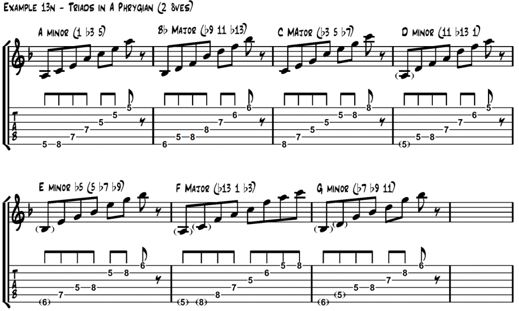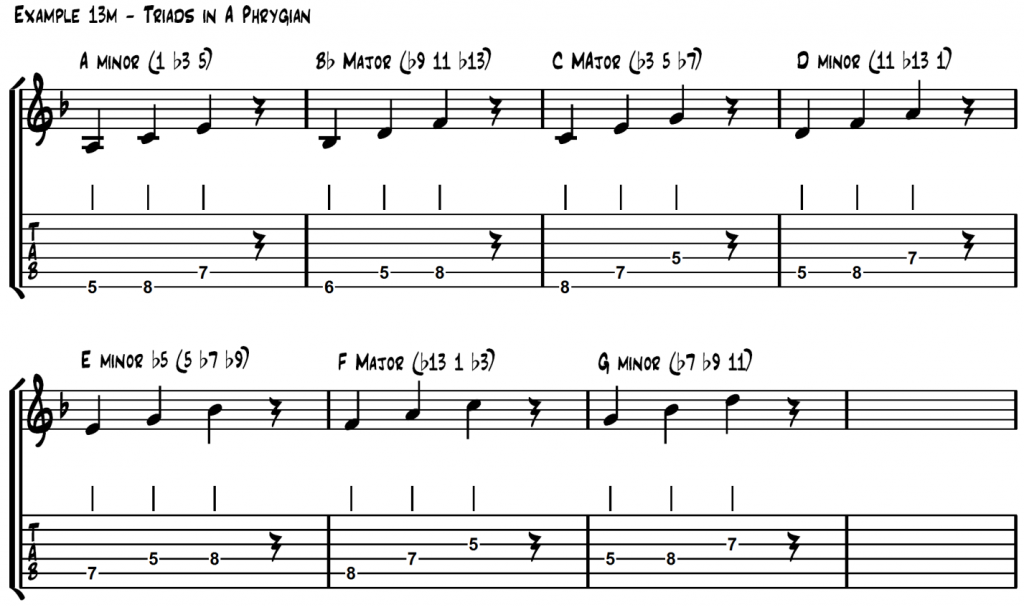 Indem wir Dreiklänge aus jeder Stufe des phrygischen Modus isolieren, können wir die Intervalle des Modus, auf die wir beim Solospiel abzielen, genau bestimmen. Die Dreiklänge jeder Stufe der Tonleiter sind unten dargestellt und die Intervalle, die gegen den Grundton (A) gebildet werden, sind angegeben.