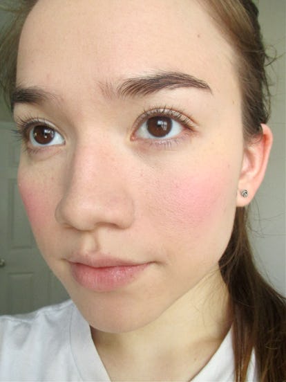 Naneste plný-krycí podkladovou bázi a korektor podle potřeby, abyste získali rovnoměrné plátno. Poté naneste světle růžovou tvářenku přímo na jablíčka tváří. Nebojte se ji rozetřít nebo zamést dozadu; chcete, aby barva byla koncentrovaná.